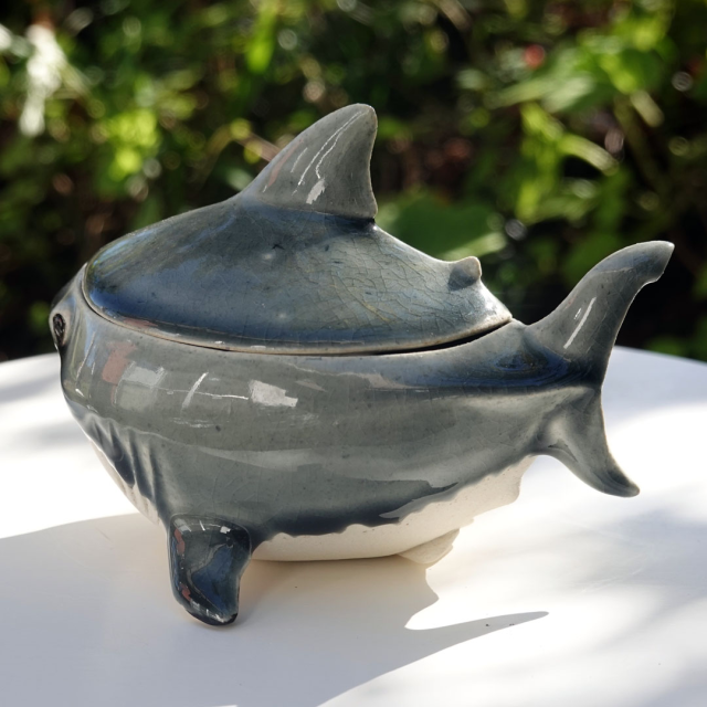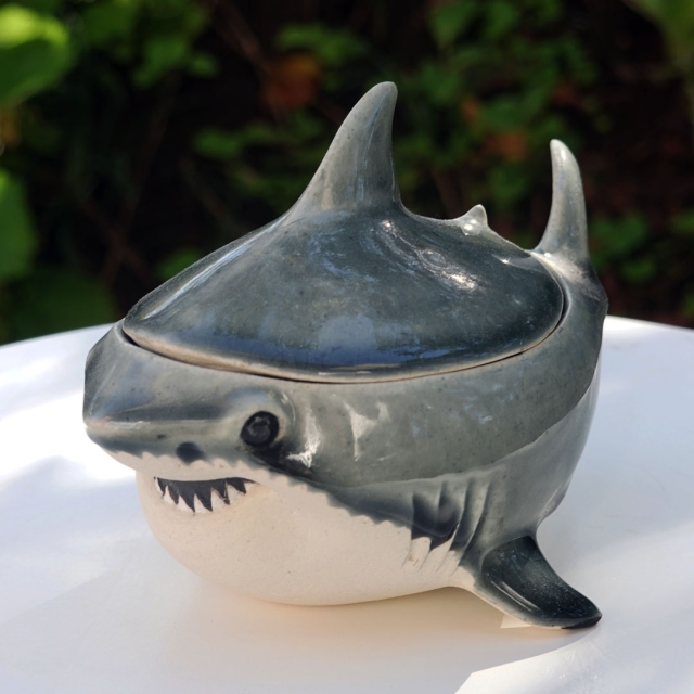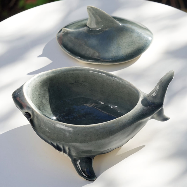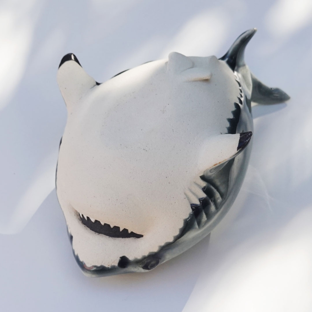 作者是セラミミック(@ceramimic2021),他製作了一個以大白鯊為造型「蓋物」,乍看下就是個可愛大白鯊造型的蓋碗,頭部被設計成蓋子,打開來就是碗的內部,不過重點是,因為是碗,所以這隻大白鯊比正常的還要「圓」,翻到底部看,就能看到大白鯊的大白肚,明明是隻叱吒海洋的獵食者,結果翻了面就像隻肥肥的小魚一樣,兼具可愛和兇猛的反差感真是太棒了。