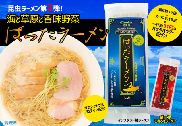 現在麵條用什麼做好像都不奇怪,像是雞蛋麵、菠菜麵、紅麴麵等等,讓麵條加入其他成分呈現不同風味。 日本販售昆蟲食品的品牌 Bugs Farm ( バグズファーム ) 繼先前推出「昆蟲拉麵」,頗受消費者好評。這次要推出第二彈-鹽味的「昆蟲拉麵」,打著有海洋、草原與香味野菜的氣息,再次挑戰各位的味蕾啦 !