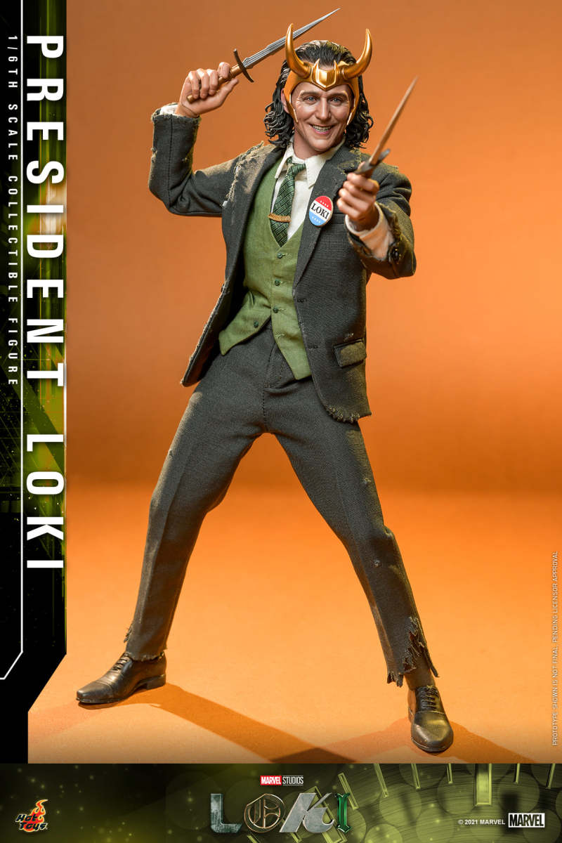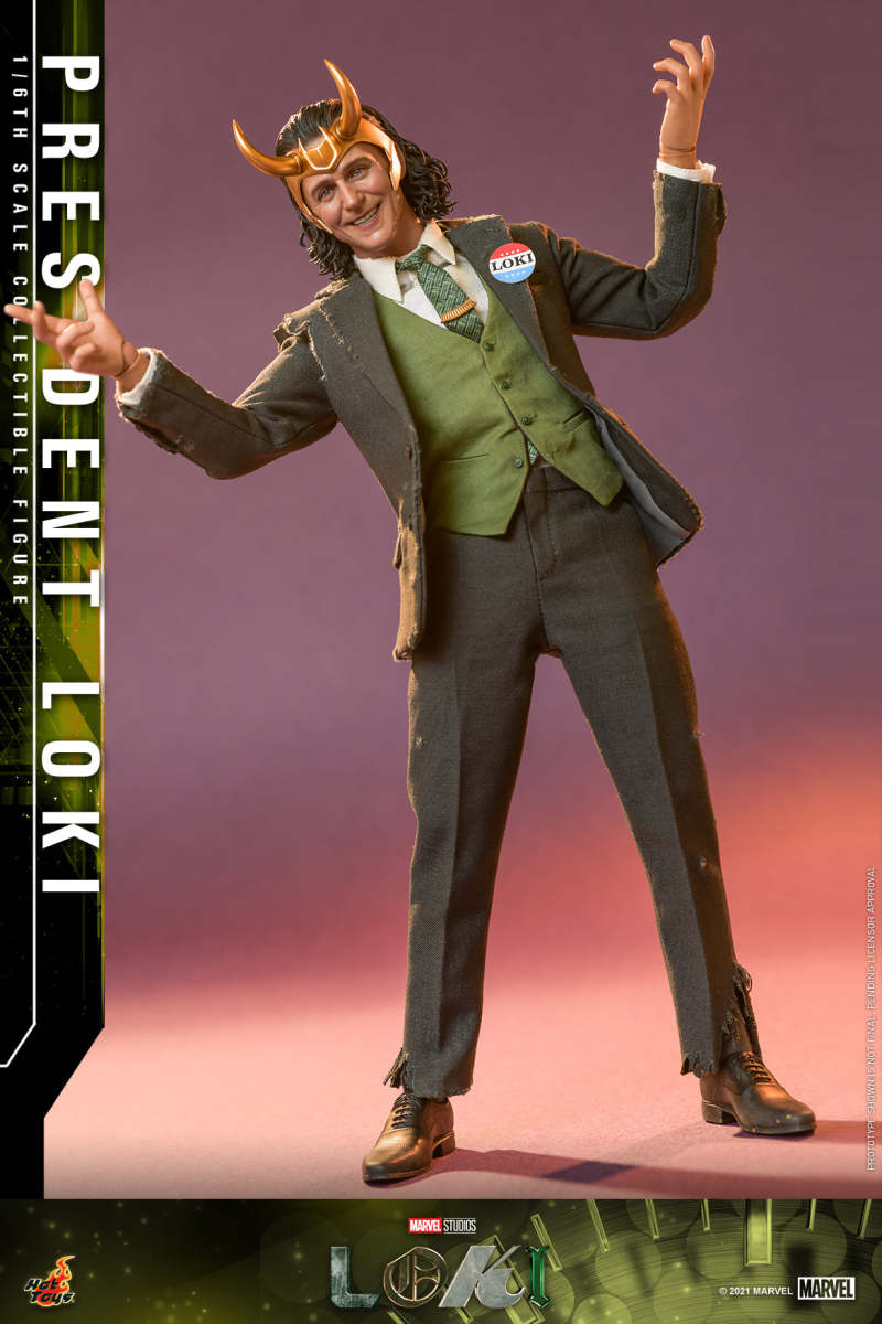 本作高約 31 公分、全身共計 30 處可動,根據《洛基》中的設定考究還原了率領眾洛基的「總統洛基」樣貌,除了搶眼的金色彎勾頭盔之外,量身縫製的灰綠色西裝、綠色背心、白襯衫,以及綠格紋領帶的搭配十分好看,遍佈各處的破損也逼真還原,頭雕打造出 Tom Hiddleston 在劇中的奸詐笑容,從神韻、面部輪廓的形塑,到往後梳的黑髮刻畫都很出色,彷彿洛基正娓娓道來自己的詭計一般生動。