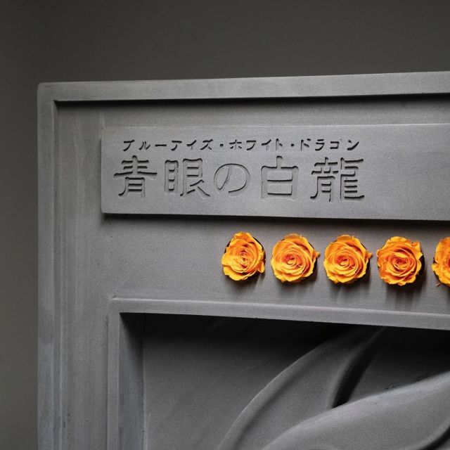 可以看到不僅是藉由雕刻技術,將卡面包含文字敘述、攻擊數值、屬性,以及青眼白龍等圖案,每一處細節的雕刻都完全不放過,且可以注意到的是星星數量的部分,還特別以橘色花朵來替代,為這張…應該說這塊青眼白龍有了畫龍點睛的效果。