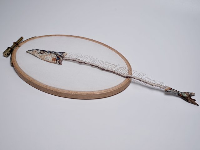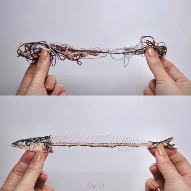 推特上有位刺繡畫家「ipnot」,更實際拍攝出影片及成果,刺出了一隻「被吃完的秋刀魚」,如果不說的話,可能完全不會發現它是手工藝作品吧?!