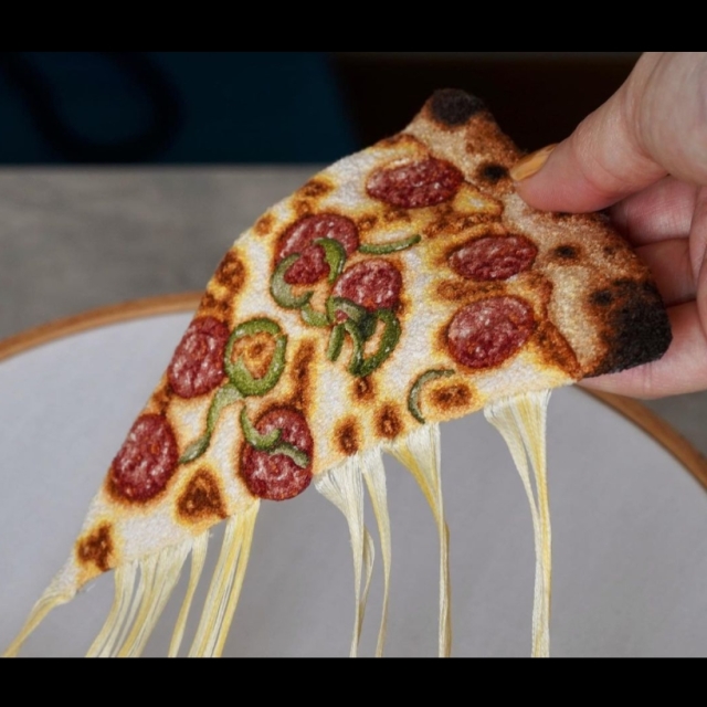 不論是任何型態的東西,ipnot似乎都可以做成刺繡作品。而相當厲害的,還有下面這個「大型披薩」。