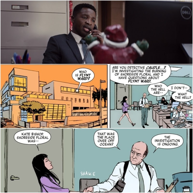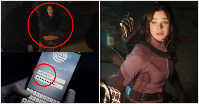凱特用自家的保全系統追蹤克林特的位址,可以看到她的帳號是bishop112012,這個數字代表的是2012年11月發行的《鷹眼》漫畫第二期,也就是凱特畢夏普在漫畫中的首次登場。而2012年也是她首次看見鷹眼,進而改變人生的年份。有趣的是凱特的密碼明顯是後製的,因為她的手指並沒有按到正確的按鍵上。