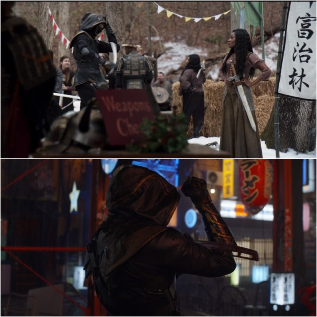 克林特前往真人扮演會場,想找摸走浪人服裝的消防員。此時可以看到他正在做一個用刀劃過手臂盔甲的動作,也就是在《復仇者聯盟:終局之戰》中克林特在東京殺完黑道份子後擦掉刀鋒上的血的動作。