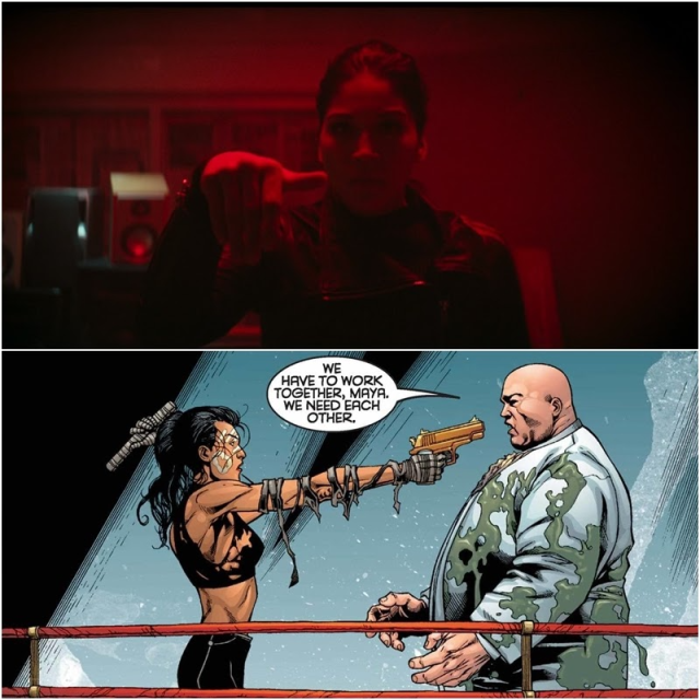 克林特成功被綁後,要求與運動服黑手黨的老大談話,此時畫面帶到一間打滿紅光的室內,黑手黨和一個神祕女子比劃著手語。她就是黑手黨幕後人物「迴聲」,本名瑪雅洛佩茲,漫畫中她是《夜魔俠》漫畫系列的常駐角色,也是金霸王的養女。後來發現她的父母其實是被金霸王殺害的,而成為英雄,並且繼承了克林特『浪人』的身份。未來也確認有她的獨立影集,所以後期應該確認是會洗白了。