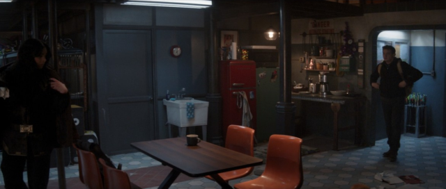 克林特找到穿浪人服裝的凱特,讓她帶自己回她住處。凱特住處的格局設計其實源自於本劇主要改編的 Matt Fraction 《鷹眼》漫畫中克林特住處的設計。此外這裡可以看到幾張明顯是樓下比薩店的桌椅,牆上還有打卡機等,說明這裡不久前才外租給她。