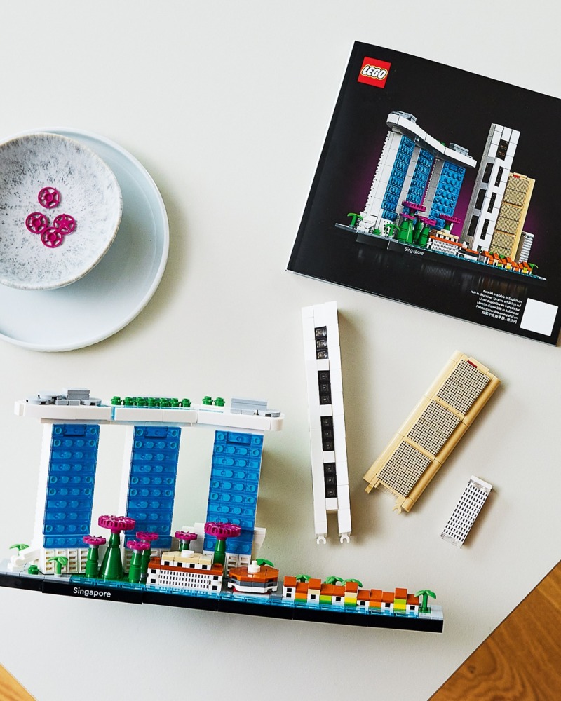 本作一共用上 827 片零件,組裝完成之後長約 28 公分,以微型比例重新詮釋出多個新加坡的知名地標、熱門景點,像是集酒店、賭場、購物於一身的綜合娛樂城「濱海灣金沙酒店」,能夠享受被擎天樹包圍的「濱海灣花園」,融合當地歷史文化與現代元素的五星級酒店「富麗敦/浮爾頓酒店」,而有著許多餐廳、酒吧座落於此的「駁船碼頭」,這邊也利用多種顏色的磚塊重現該處繽紛的比鄰店家;不過,沒看到魚尾獅總覺得少了什麼呢。