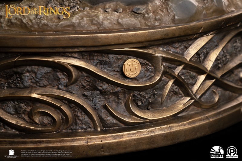 本次以極致工藝打造的「Master Forge 勒苟拉斯」高約 104 公分,打造出勒苟拉斯左手持弓、右手伸往背後的箭筒,正準備抽出一支箭開射的造型,稍稍壓低的身體重心、凝視前方的雙眼,與微微皺眉的神情,生動傳達出勒苟拉斯在察覺到危機時的應對姿態,多層搭配的服裝、手前臂護甲、皮革感裝備帶、箭筒......等都刻畫出華美的紋路,製作出《魔戒》LOGO 的底座還有仿岩石環境的逼真描繪。