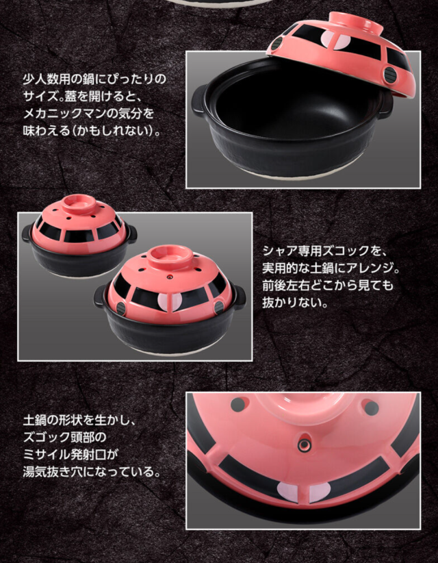 這次GUNDAM Café推出的造型陶鍋,採用 Q 版的茲寇克來打造,以渾圓的頭部製作成陶鍋的鍋蓋,並以紅色造型證明是夏亞大人專用的機型,讓你煮東西三倍速,吃火鍋不等人 XD。