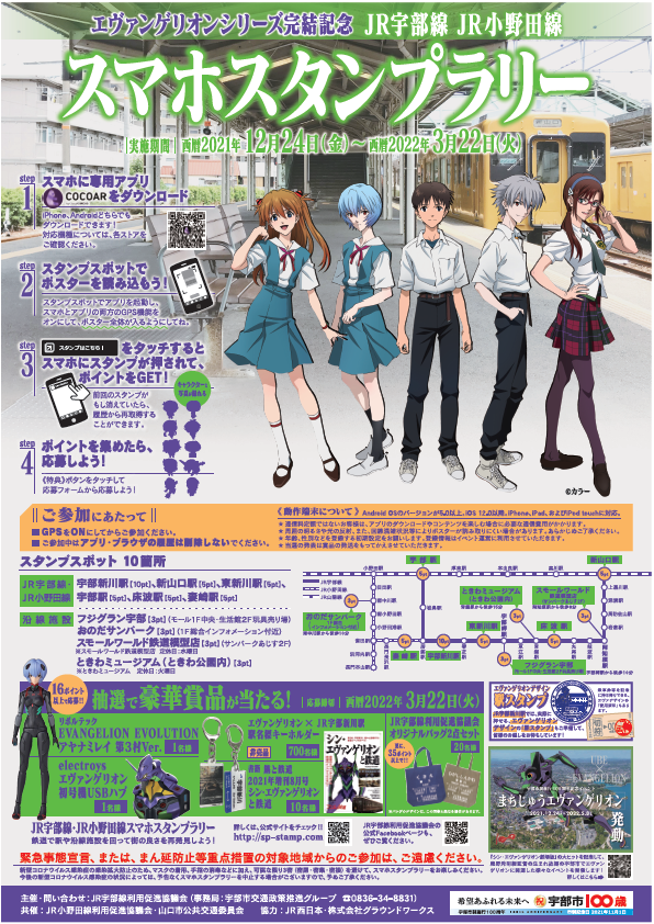 首先是當地的 JR 車站活動,JR 宇部縣& JR 小野田縣的車站中,可以使用手機應用程式「COCOAR」,掃描各車站所配置的 QR Code,將會有配合的福音戰士人物可以與你進行 AR 拍照體驗,並可以累積點數,參加抽獎,獎品當然也是福音戰士相關的商品。活動期間為 2021 年 12 月 24 日至 2022 年 3 月 22 日止。