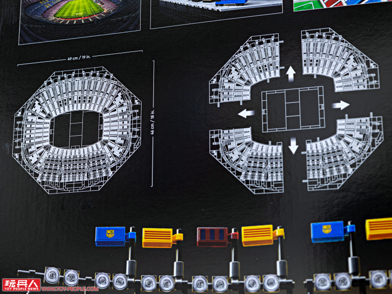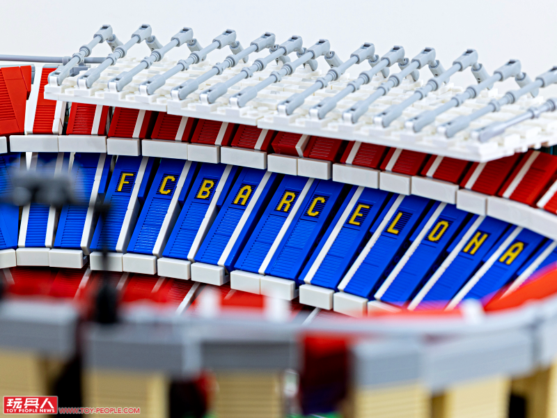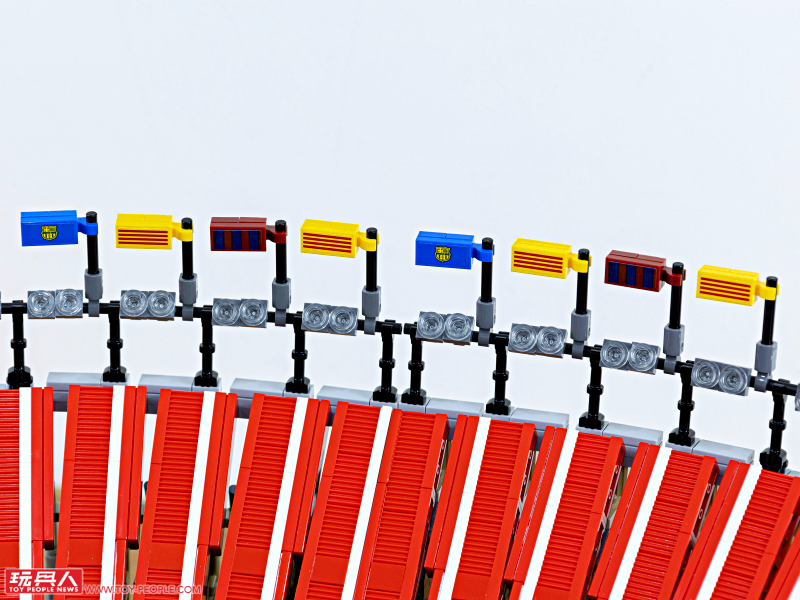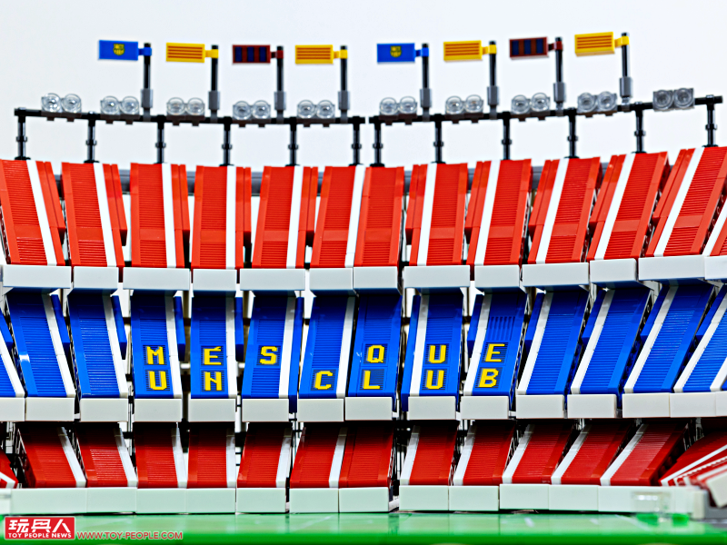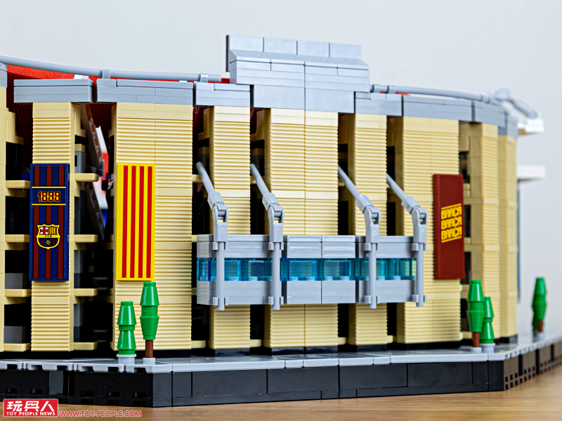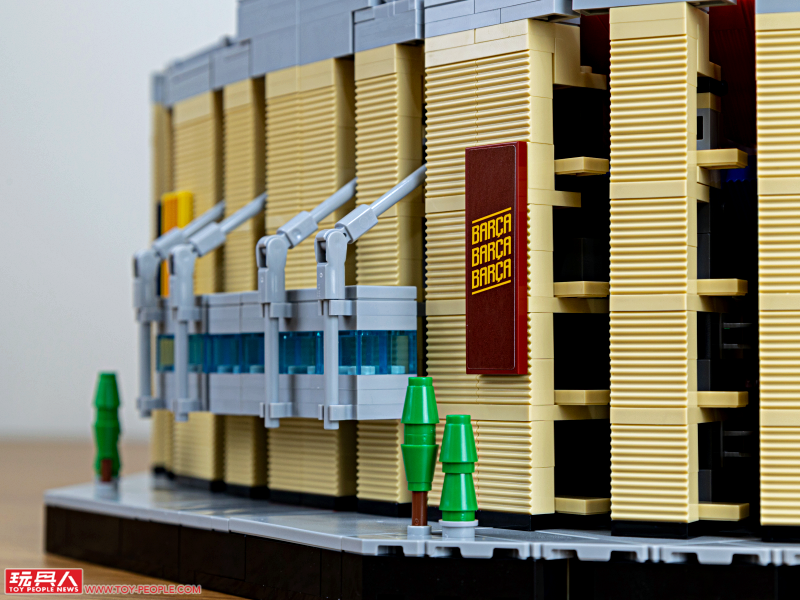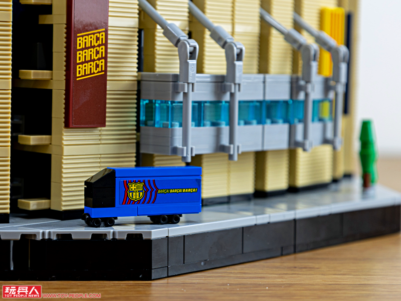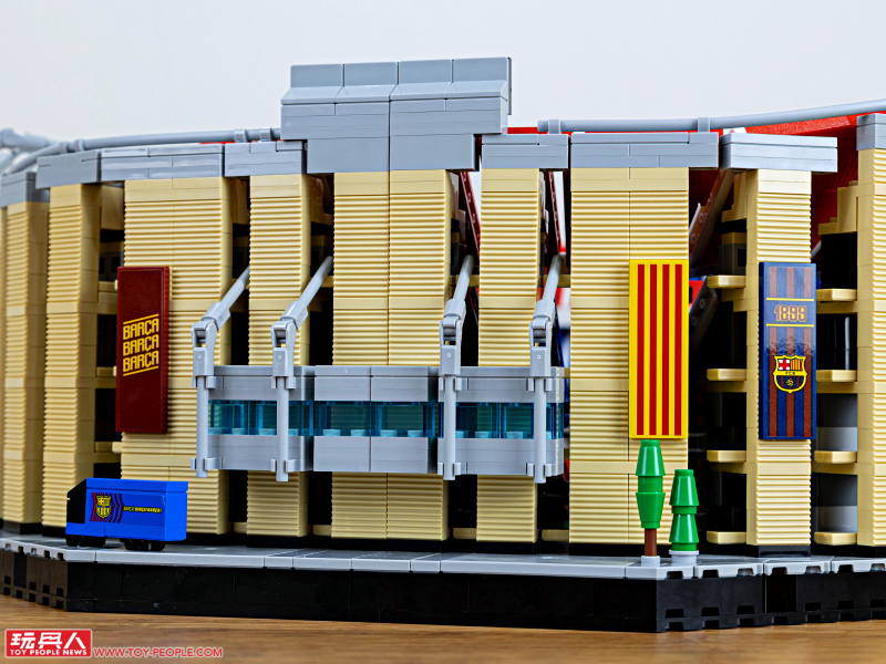 ▼ 再來看到球場外圍部分的結構與元素,大面積的灰色底版、僅僅三個零件做出的樹木、球隊巴士的迷你模型,以及加泰隆尼亞地區的旗幟......等,盡可能地還原球場實際的外觀,巴薩旗幟上的 1899 則是球隊創立的年份。