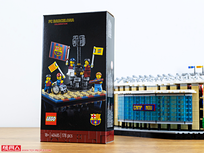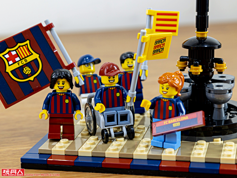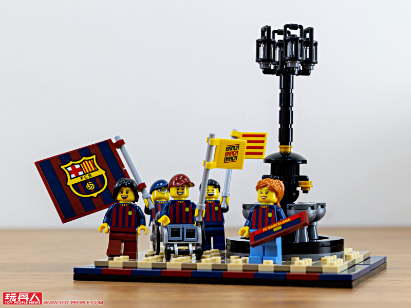 以上就是這次「諾坎普球場」樂高的部分,接著讓我們來看看同場加映的「40485 巴塞隆那慶典」(FC Barcelona Celebration),這一款 178 個零件的迷你場景+人物組是購買「10284 諾坎普球場」就會免費贈送的滿額禮盒組,是根據蘭布拉大道(La Rambla)的卡納雷特斯噴泉(Font de Canaletes)為主軸設計,加上 5 位正在慶祝球隊獲勝的巴薩迷樂高人偶,除了標誌性的紅藍服裝之外,還附上隊旗、加泰隆尼亞旗幟,就連底板也是紅藍配色喔!
