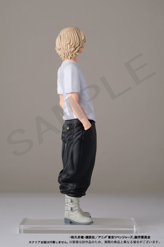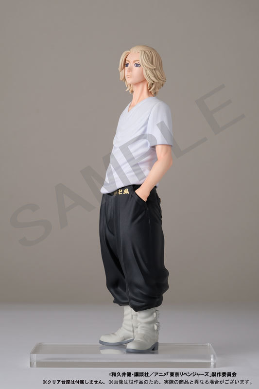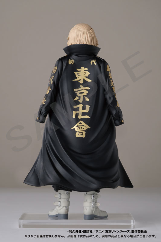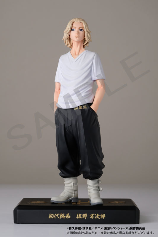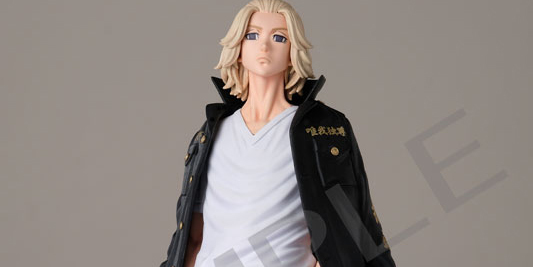 「佐野萬次郎」PVC塗裝完成品,尺寸全高約 21 公分,將 Mikey 臉上酷酷的表情與雙手插口袋的站姿立體化,還原金髮與綁公主頭的髮型,簡單的V領白T搭配披在肩上的煞氣特攻服;特攻服上的「初代東京卍會」、「初代總長」、「天上天下唯我獨尊」等字樣都以金色塗裝質感重現!