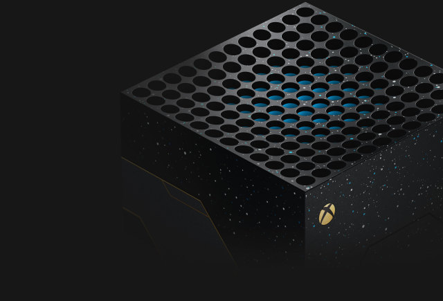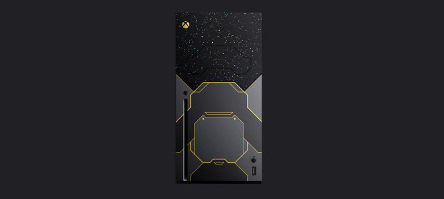 從主機外觀圖中可以看到,此次的Xbox Series X同捆機是以當家代表遊戲《最後一戰》為主所打造的,整體色彩外觀以灰、黑兩色作為底,來凸顯金黃色的紋路,形成搶眼的對比色調,且各位還能仔細觀察到,在主機的表面上還佈滿著一點一點的星星,來呈現夜空的樣貌,更是與《最後一戰》主題相呼應著。