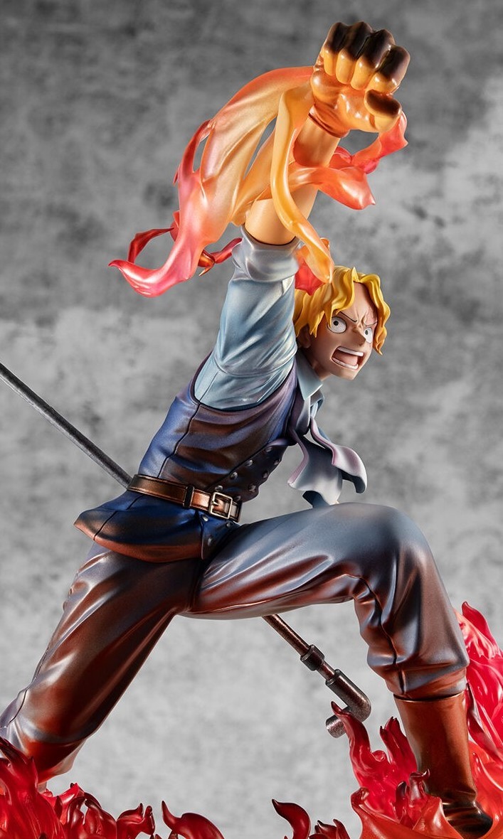 「P.O.P "LIMITED EDITION" 薩波~火拳繼承~」PVC 塗裝完成品,將薩波手拿鐵水管、飛舞火焰纏繞身軀的魄力造型立體化,尺寸全高約 24 公分,還原繼承燒燒果實後施展出艾斯經典招式「火拳」的震撼一幕!一身貴氣的服裝除了因動作而生動飄揚,更是施以如火光照耀的光影塗裝,增添臨場感!