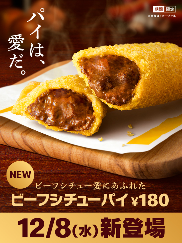 也隨著寒冷的冬季來襲,日本麥當勞在這個季節也特別推出了限定餐點「燉牛肉派」,將以往極具代表麥當勞的蘋果派或是芋頭派的餡料,替換成了鮮嫩多汁的燉牛肉,還特別加入了馬鈴薯、胡蘿蔔等風味來細心煨出香味。