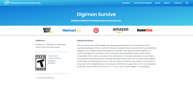 而在今年10月時,外媒傳出《數碼寶貝 絕境求生》遊戲繼巴西與澳大利亞,也通過了韓國電玩分級組織「遊戲物管理委員會(게임물관리위원회)」的分級後,日前該款遊戲也已經正式確定通過北美「娛樂軟體分級委員會」(Entertainment Software Rating Board;簡稱ESRB)分級,意味著多次延期的《數碼寶貝》系列電玩終於有機會在2022年期間問世。