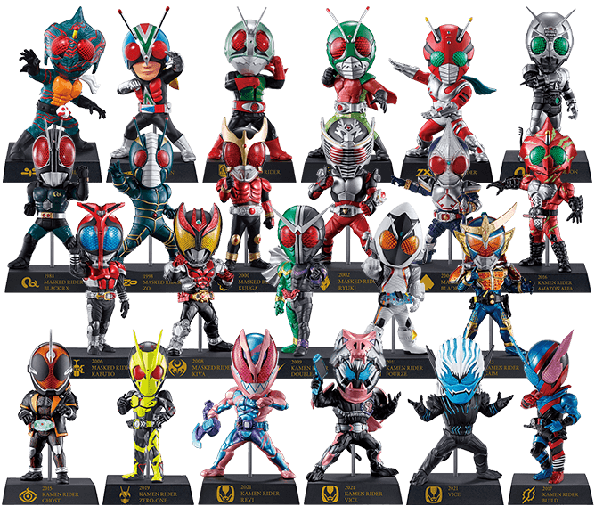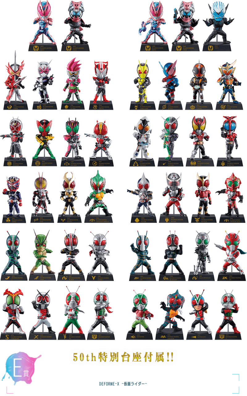 一共推出豐富又華麗的 23 位假面騎士角色,每款皆附有標示著年份與 LOGO 的 50 週年特別專屬底座!一字排開超魄力大集合~
