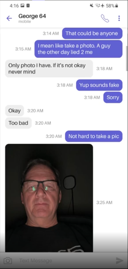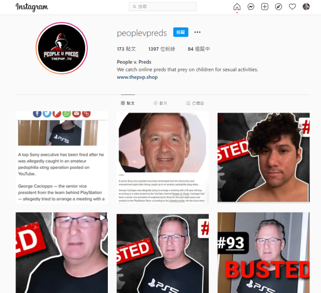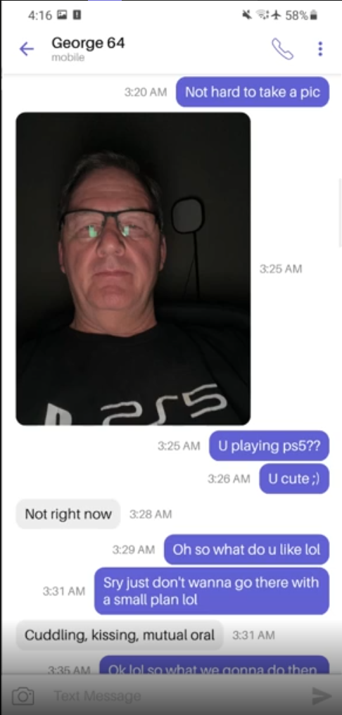 民間機構People v. Preds也在Instagram上所公開的對話紀錄影片中,包含了在雙方的交談內容,雙方交換大頭照、地址等資訊,以及私密對話等等,而George Cacioppo向People v. Preds所假冒的「15歲Jeff」所傳送的大頭照,也與後來People v. Preds所釋出的照片完全一致,皆是George Cacioppo穿著PS5 T恤的打扮。