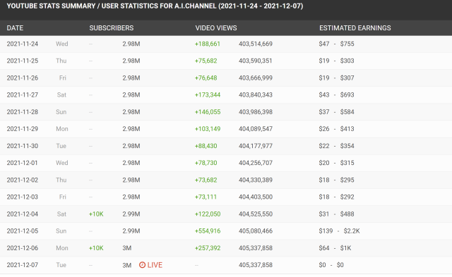 ▼ 由 socialblade 所提供的絆愛「A.I.Channel」頻道近期數據。