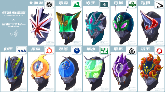 推特上一名畫師ザギザギ(@actct_zagi)將全日本47都道府縣的縣徽作為原型設計出了代表各縣的假面騎士,也就是說他一次設計出47位騎士遍布於全日本。作者說會想畫出這些騎士的念頭起源於他發現岡山縣徽和假面騎士紋章有點相似,於是就著手開始設計這些都道府縣騎士了。