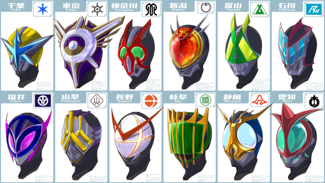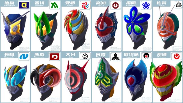 每位騎士的面部都以縣徽為造型去設計,而有些有著騎士都繪有的「複眼」設計,有些則是充滿反派模樣,有些更是滿滿的「東映式美感」,這47位騎士各有各的特色,稍微想一下,若這47位騎士齊聚一堂那會是多麼壯觀的景象啊!