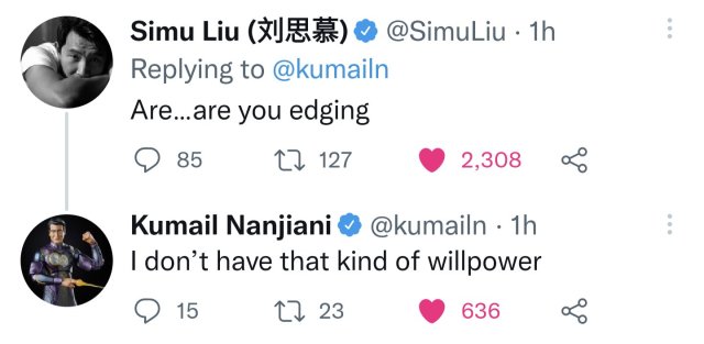 在另一部漫威電影《永恆族》(Eternals)中飾演「金勾」的庫梅爾南賈尼(Kumail Nanjiani)便在那篇歡樂的貼文下方簡短且似乎帶點不滿地回了:「對。噢對。噢,噢對。」