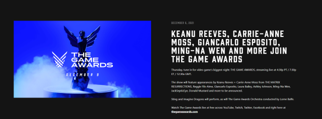 一年一度的電玩界奧斯卡大獎「The Game Awards」,在上回釋出了多個獎項的遊戲入圍名單後,不僅很快地也將在2021年12月9日這天正式公布得獎結果,同時也確認邀請到基努·李維(Keanu Reeves)、凱莉-安·摩絲(Carrie-Anne Moss)、詹卡洛·埃斯波西托(Giancarlo Esposito),以及溫明娜等重量級嘉賓來參與本屆TGA 2021的頒獎典禮。