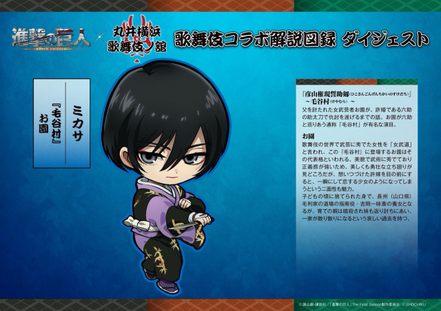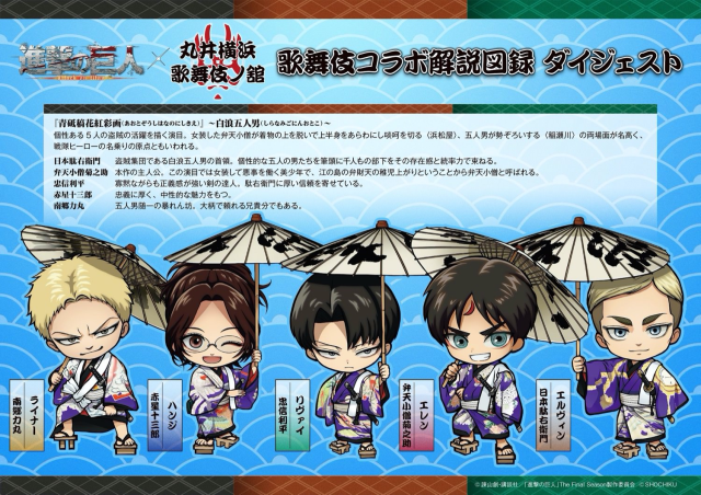 另外也有繪製 Q 版的人物宣傳圖,一樣穿上歌舞伎服的艾蓮、里維、漢吉、萊納與艾爾文五人的 Q 版模樣,各別也都有代表的歌舞伎人物。