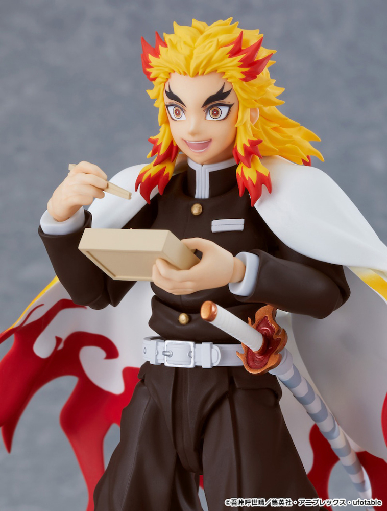 「figma 煉獄杏壽郎」,尺寸約為 15.5 公分,將大哥化身 figma 可動人偶,造型出火焰般燃燒的頭髮、眉毛等特徵,附有自信微笑的普通臉、自帶「好吃」音效的笑臉,以及受傷流血的戰鬥臉三種替換表情,搭配雙手抱胸、拿便當和揮刀等替換手勢,賞玩劇中各種姿態的大哥~(但就是沒有甜甜圈替換件阿)