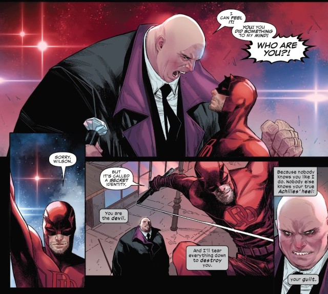 故事開始時,費斯克發現他手中握有的夜魔俠真實身分的資料變成了一團亂七八糟,於是找上夜魔俠來對峙。的確,之前他為了讓一度被公開的身分恢復秘密,利用了反派「紫人」(Purple Man)兒子的力量使所有人都無法認知到相關資訊。