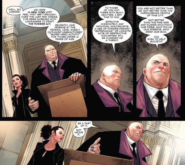 費斯克市長當然不是省油的燈。不久,他便在公開記者會上宣布通過了一項「超能法案」(The Powers Act),禁止任何紐約市內的超級英雄活動,一律視為罪犯逮捕,並試圖將其推展到整個美國。