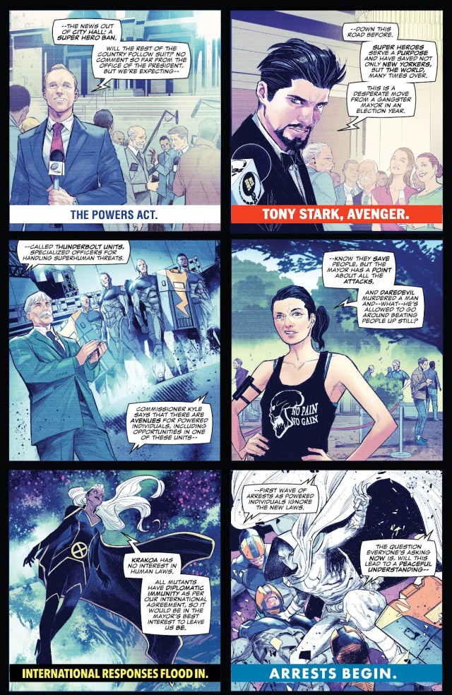 整個情況不禁讓人想起當年的大事件《內戰》(Civil War),而記者也找上了「鋼鐵人」東尼‧史塔克採訪。對此他當然是嗤之以鼻,認為這不過是一位流氓市長為了競選而丟出的最後一手。全國國民都是超能力者的變種國克拉科則表示他們不受人類法律約束。