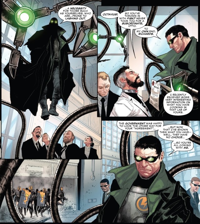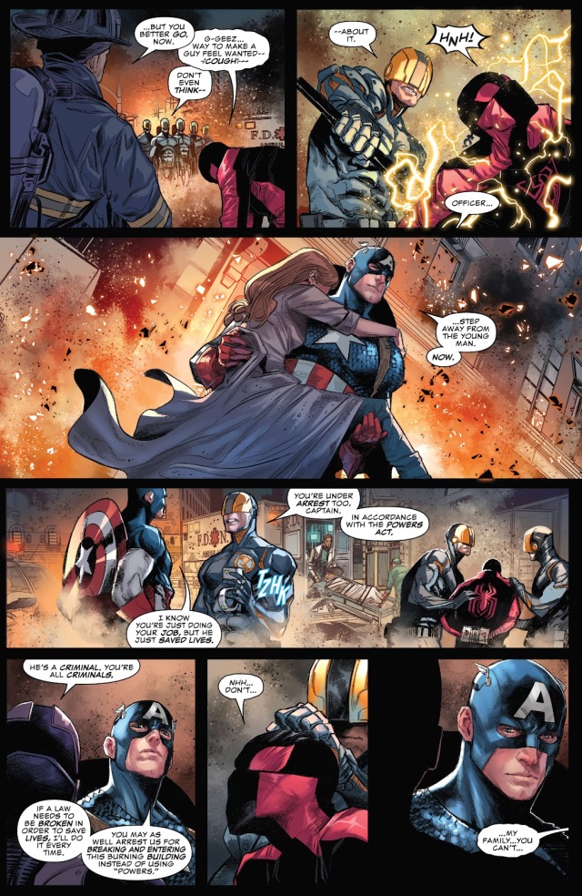 在自己的連載中默默守護著行走於夜晚之人的月光騎士(Moon Knight)當然馬上就被全新的警察單位「雷霆部隊」(Thunderbolt Units)給找上;二代蜘蛛人邁爾斯‧莫拉雷斯(Miles Morales)和美國隊長(Captain America)只是進入火場救人,也被當成罪犯來逮捕。