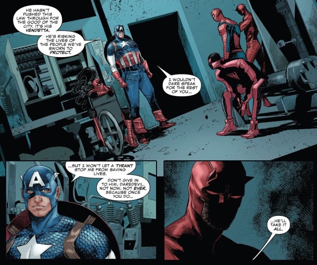 但是美國隊長可不受法律的束縛,並與及時趕到的兩位夜魔俠和新蜘蛛人一起救出二代蜘蛛人並成功逃跑。