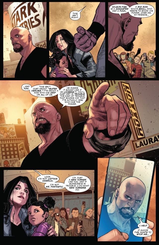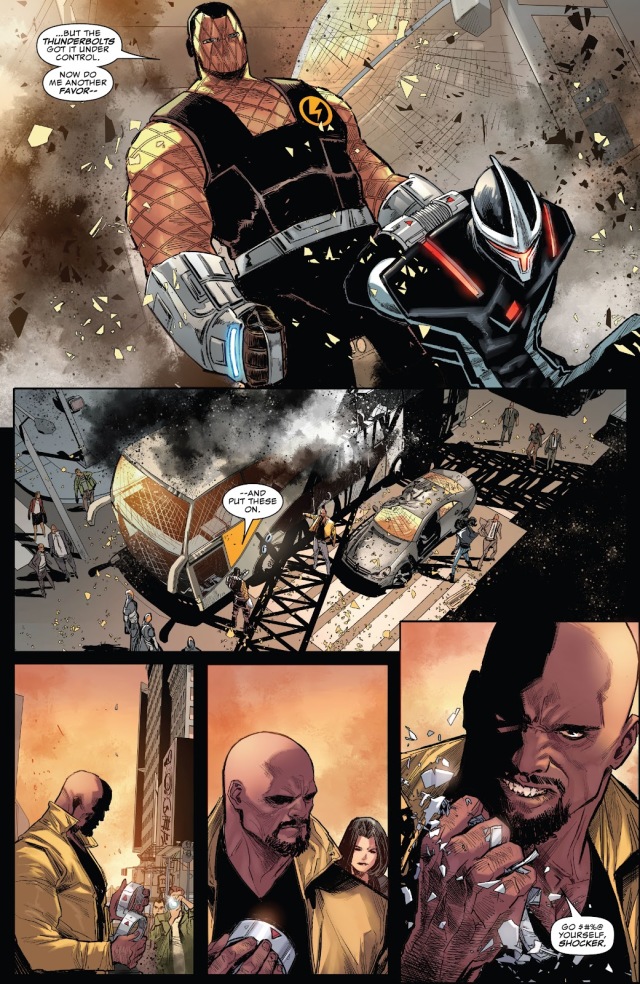 至於盧克‧凱奇(Luke Cage)和潔西卡‧瓊斯(Jessica Jones)夫婦和女兒丹妮(Dani Cage)則遇上了一起交通意外,隨後出現的是剛逮捕了「暗鷹」(Darkhawk)的雷霆特工隊成員「震動人」(Shocker),並因為盧克出手讓車子不會傷害到周遭民眾而把囂張地手銬丟給他叫他自己戴上。