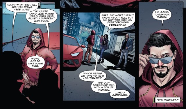 不過他們當然也得避避風頭。然而,意料之外的訪客出現了。鋼鐵人也要出手阻止費斯克,並且要透過與他一樣正當的手段做到這一點:他要去跟他競選紐約市市長!