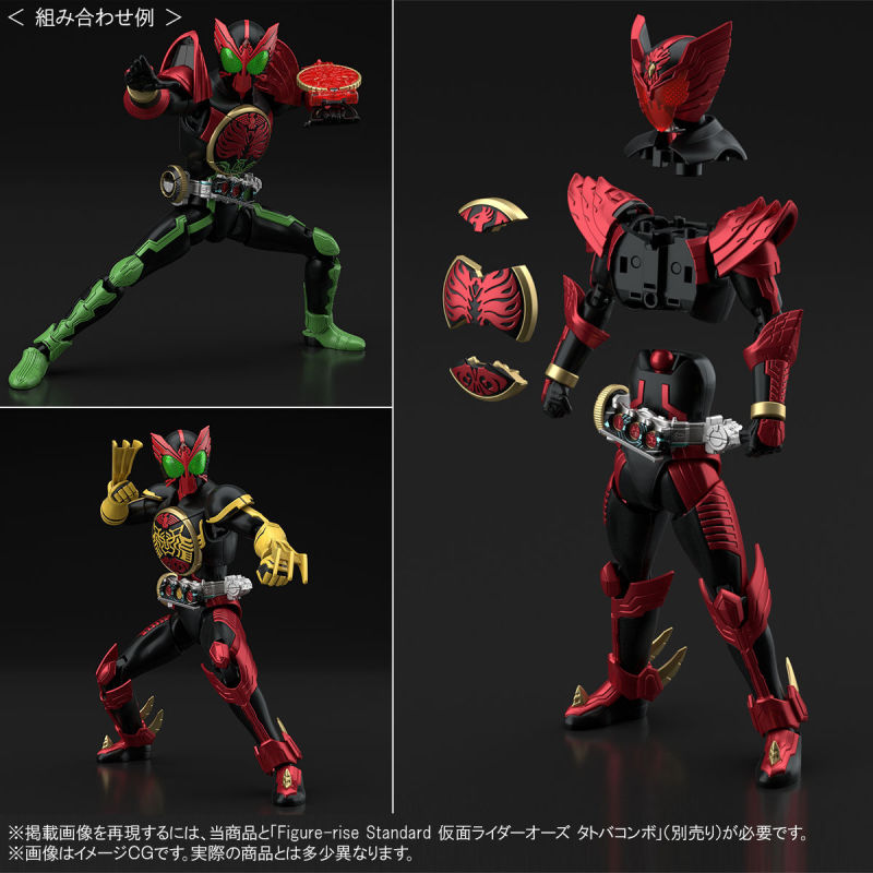 「Figure-rise Standard 假面騎士OOO 鷹孔鷲聯組」基於鷹虎蝗聯組的可動素體製作,運用多數新規零件再現鷹孔鷲聯組的豔紅色彩與銳利造型、可放入腰帶再現變身狀態的老鷹、孔雀、禿鷲三種核心硬幣、刻畫出硬幣放置槽精密造型的盾型武裝「TaJa Spinner」。