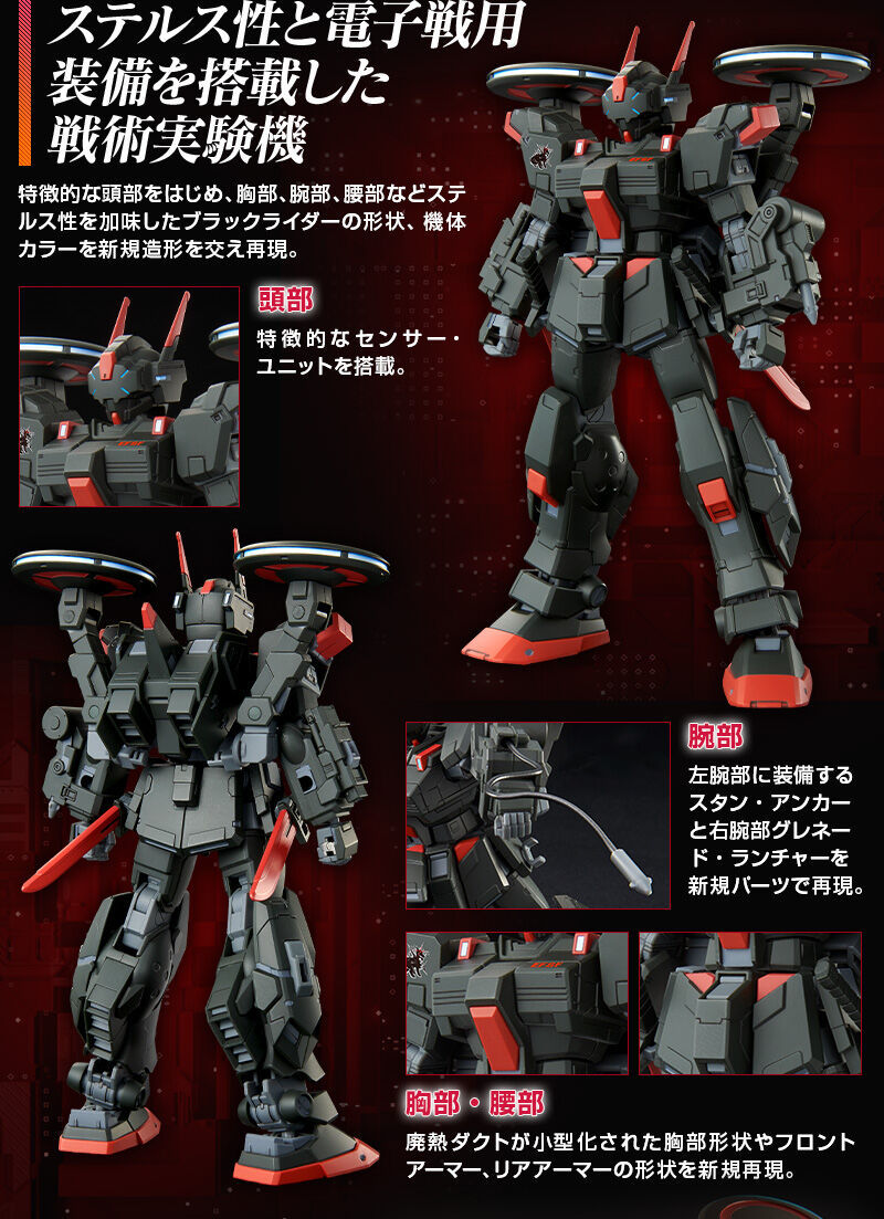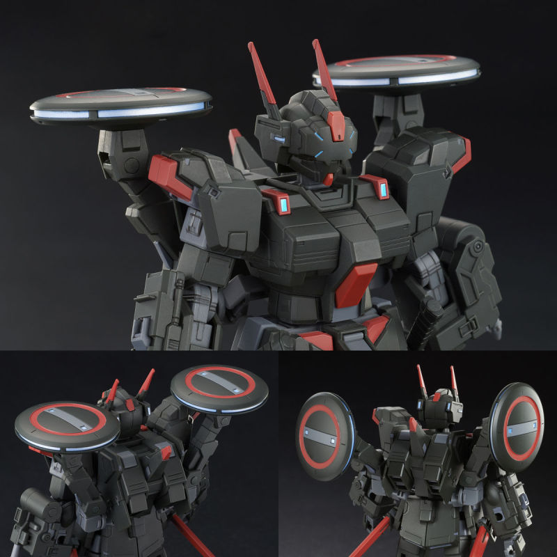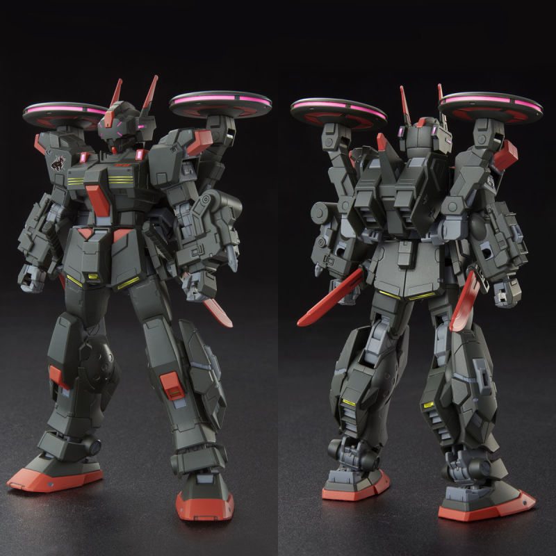 「HG 1/144 黑騎士」以過去推出的蒼白騎士套件為基礎,以新規零件再現特徵的頭部、胸部、腕部、腰部,包含頭部的感測組件、腕部搭載的榴彈發射器與錨、小型化的散熱口等細節,背部碟形的「steelyard」可藉由可動支架靈活轉動,此外也收錄了熱能短刀、磁軌加農砲等武裝。運用兩種貼紙就能再現一般狀態/THEMIS系統啟動狀態的色彩差異。