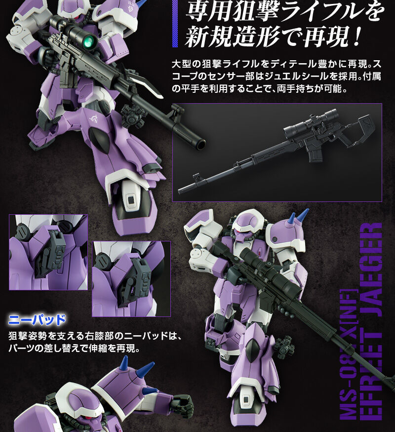 「HG 1/144 伊弗利特獵裝型」以過去發售的伊弗利特系列機套件為基礎,以新規零件再現頭部、肩甲、腕部盾牌、胸腰部...等多處造型,並將成型色替換為海倫娜的紫白個人配色,武裝配件附有新規造型的大型狙擊步槍、熱能短刀、散彈槍等,並能以替換零件方式再現膝部穩定裝置,再現帥氣狙擊姿態!