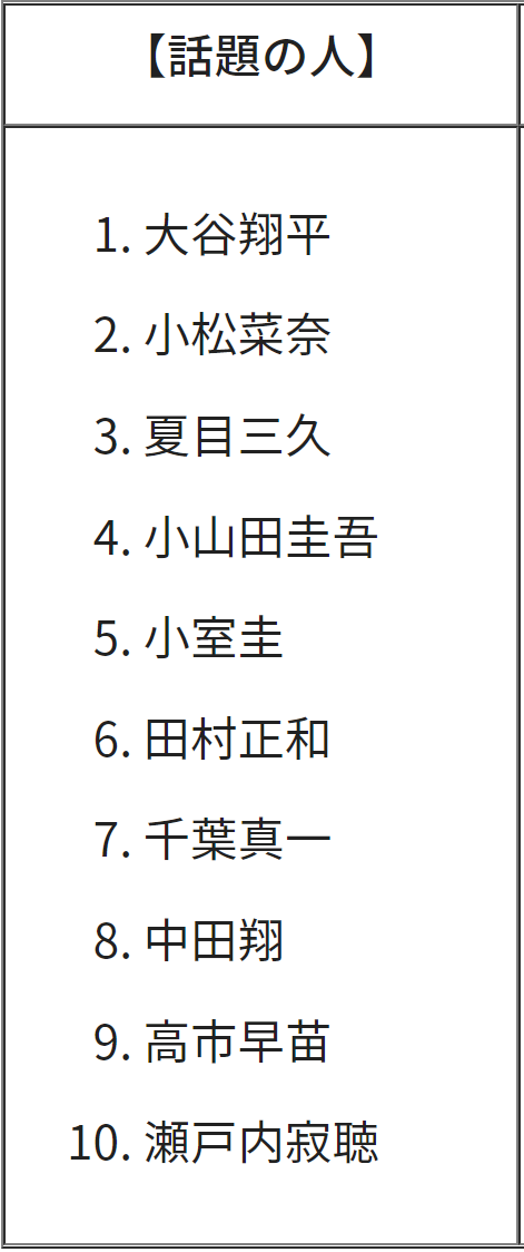 這部分就可以看到日本今年度最具話題的人,由大谷翔平奪冠絲毫不讓人意外 www;而今年新婚的小松菜奈與主播夏目三久 ( 與有吉弘行結婚 ) 分別奪得二、三名。而今年爆出霸凌風波的歌手小山田圭吾則為第四名,而娶到真子公主的小室圭為年度話題人物第五名。