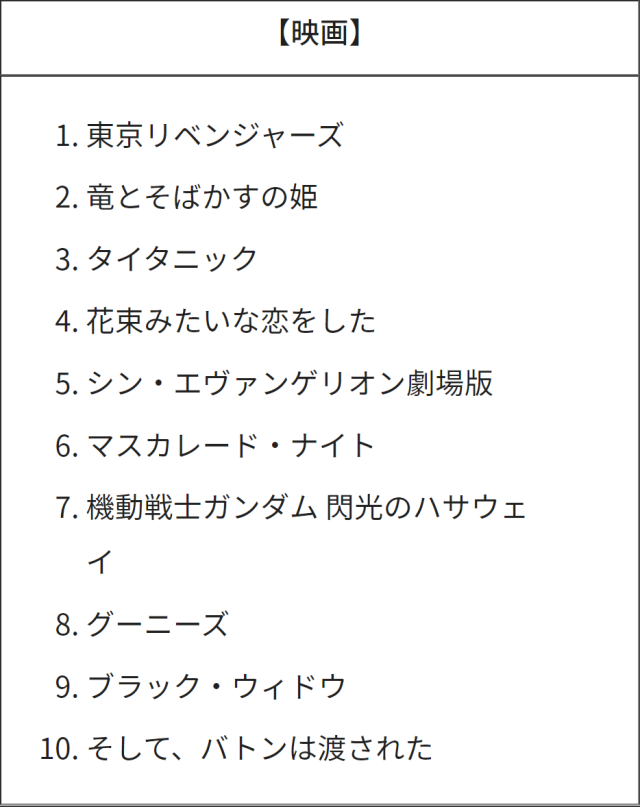 第一名為推出真人電影的《東京卍復仇者》;第二為細田守導演大作《龍與雀斑公主》;第三為經典電影《鐵達尼號》;第四為由菅田將暉&有村架純主演,今年 1 月上映的《花束般的戀愛》;第五為今年總算完結的《福音戰士新劇場版:終》。