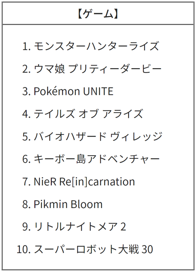 首位為《魔物獵人 崛起》,第二為《賽馬娘Pretty Derby》;第三名是 7 月推出的《寶可夢大集結》;第四為《破曉傳奇》 ;第五則是《惡靈古堡 村莊》 。