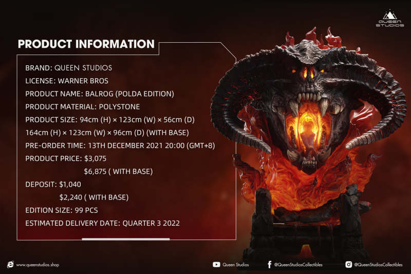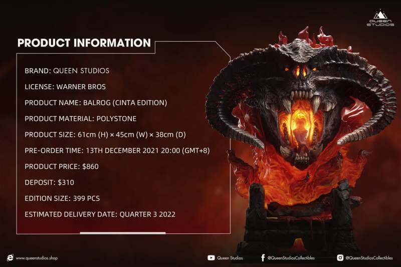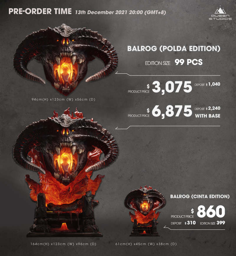 擅長以大比例雕像表現角色魅力、重現逼真細節的造型廠牌 Queen Studios 日前發表了出自《魔戒》的最新作「炎魔」(Balrog)胸像!並將同步推出超巨大尺寸的 Polda 版本與相對迷你的 Cinta 版本,預計將於 2022 年第三季發貨。