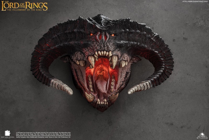這次「炎魔」胸像可說是以細緻雕刻、巨大存在感兩大賣點擄獲魔戒迷的心,雖說 Cinta 版本尺寸較小,但高度也有 61 公分,而 Polda 版則是有足足一個成人身高的 164 公分!不只仔細刻畫出炎魔頭部的造型與懾人的彎曲犄角,與之前我們介紹過的炎魔雕像、可動玩具相比,這次 Queen Studios 在犄角末端、牙齒、嘴部......等處的塗裝似乎更有「骨」的質感,散發出遠古魔獸的氛圍,搭配底座、發光功能,再現炎魔狂暴無比的氣勢!
