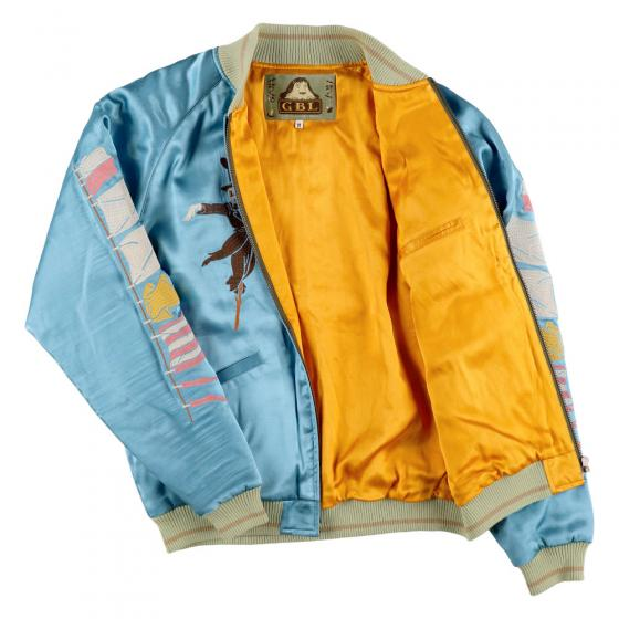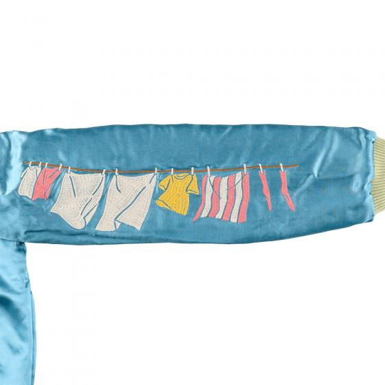 以天空藍的緞面材質製作,在兩側手繡上都有著城堡上掛著曬洗衣物的圖案,並在背後大大的放上移動中的城堡圖案,簡單又有力的設計。搭配內裡帶有鋪棉的黃色撞色,穿著上非常顯眼又不失作品韻味。