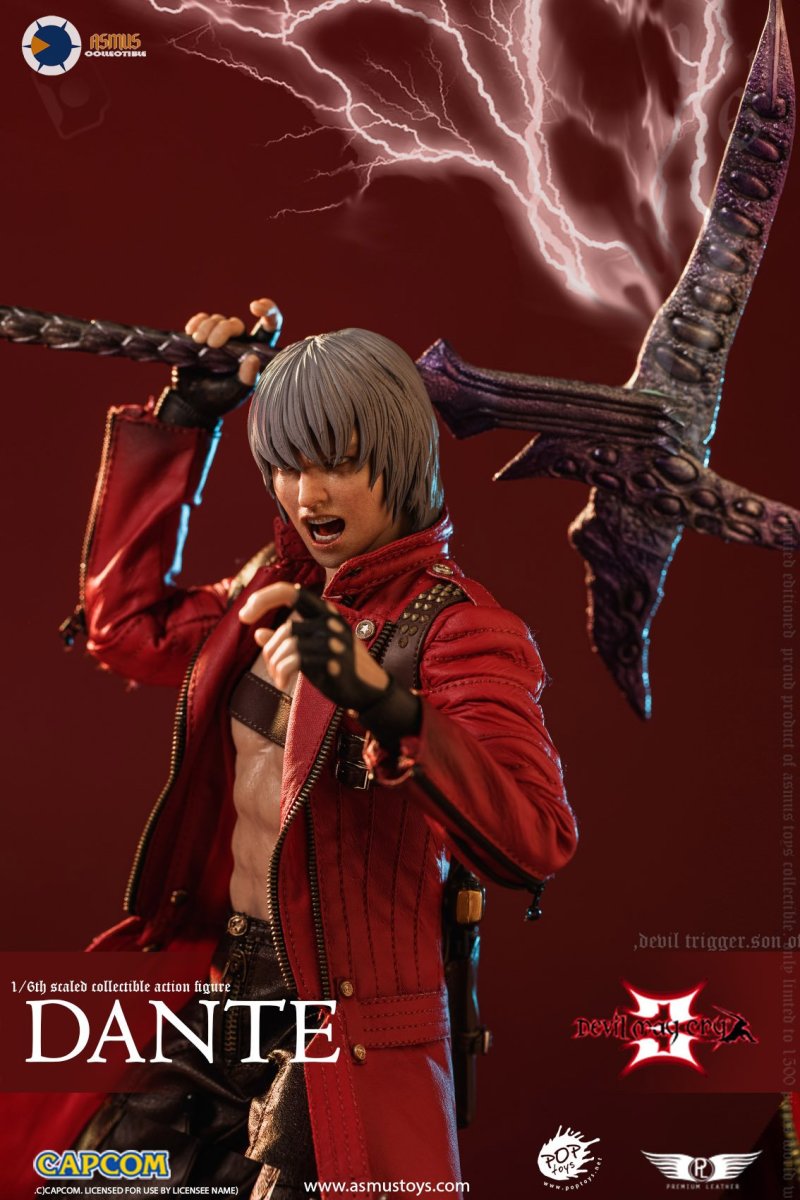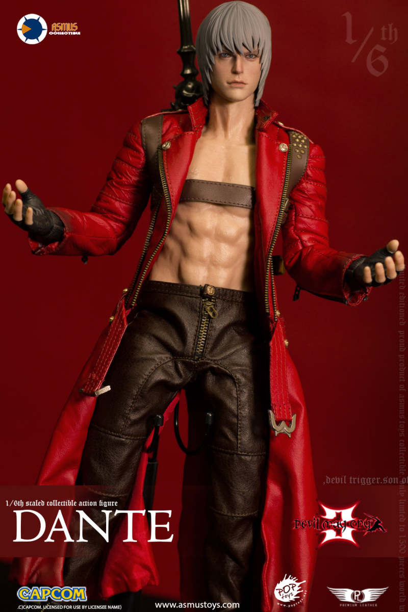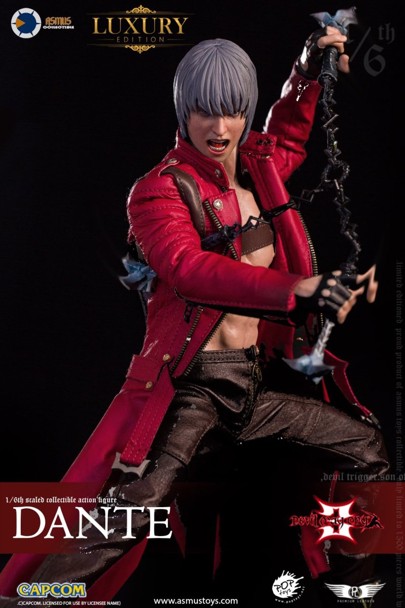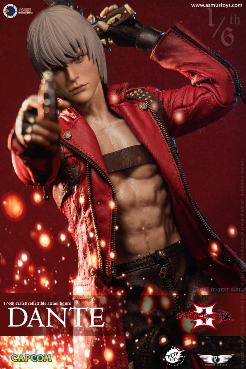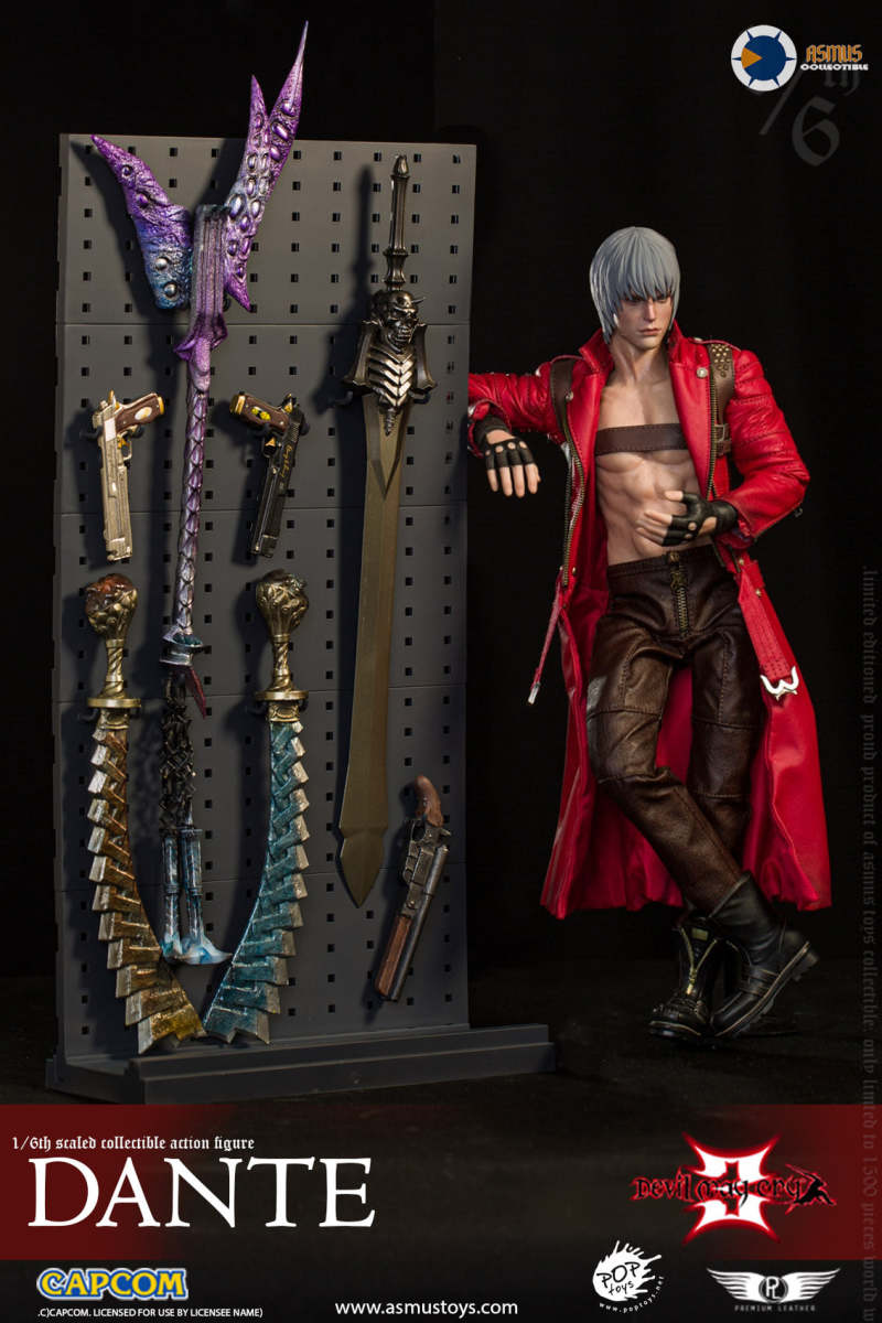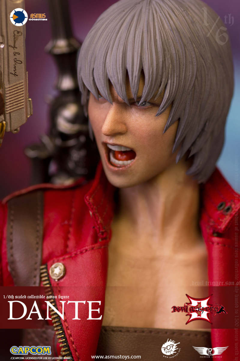 由 Asmus Toys 再次推出的「但丁」1/6 比例收藏級可動人偶,尺寸全高約 31 公分,全身可動關節共有 32 處,以新規的頭雕充分還原了但丁在《惡魔獵人3》遊戲中的造型,銀白色頭髮、藍色的眼睛,布料縫製的招牌紅色大衣底下精壯結實的肌肉,搭配前衛的皮帶、黑色皮褲皆出色呈現!標準版配備有張嘴吶喊的戰鬥頭雕,黑白雙槍「象牙&黑檀」和大劍「叛逆(Rebellion)」及火箭筒等。
