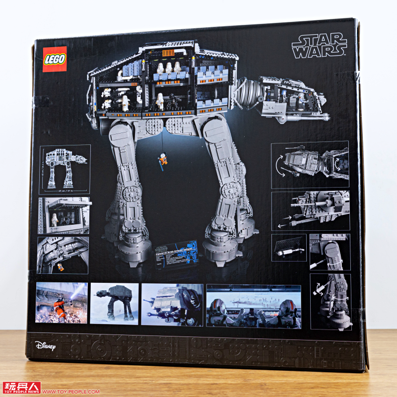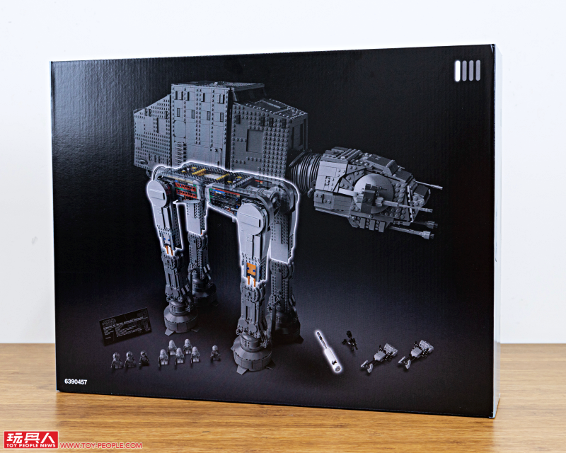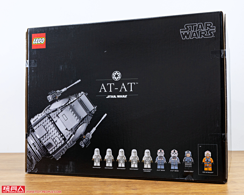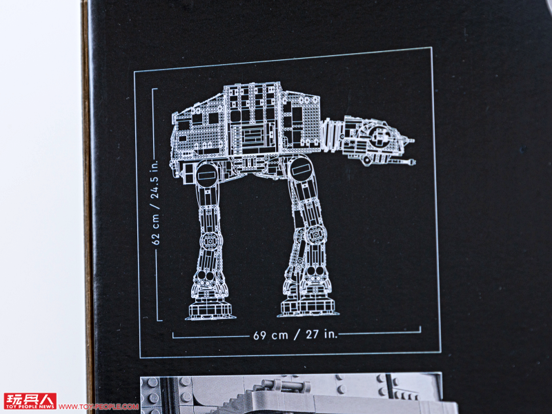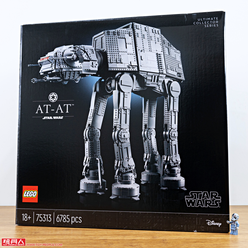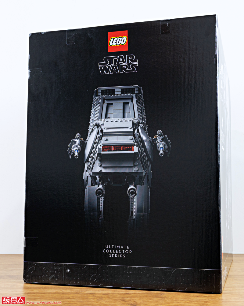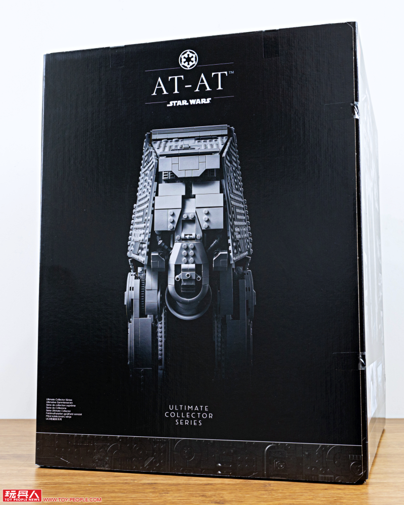 ▼ 首先看到包裝盒正面,素面黑底充分凸顯了 AT-AT 本體,並有象徵銀河帝國的標誌,右上角還印製了 UCS 的系列名稱,這次的外盒也是相當巨大,小編特地請到了迷你駕駛員在一旁當比例尺。