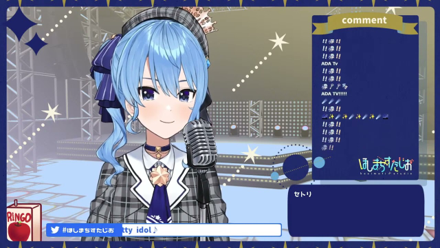 以類似 Glitch 的故障跳針畫面呈現星街彗星身為虛擬偶像的概念,背後印有聯名的設計圖像。