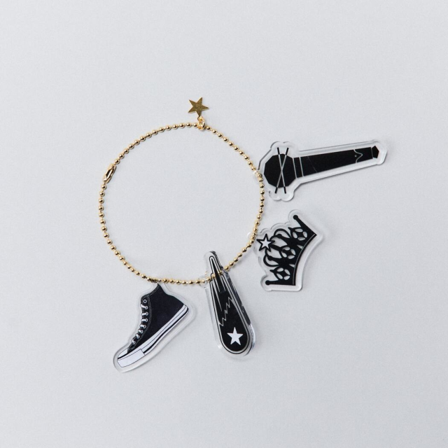 麥克風、王冠和彗星並附上鞋子的壓克力鑰匙圈飾品,這也是本次的原創設計。可以將它掛在褲子或裙子的腰帶環上,或掛在包包上,作為裝飾使用。